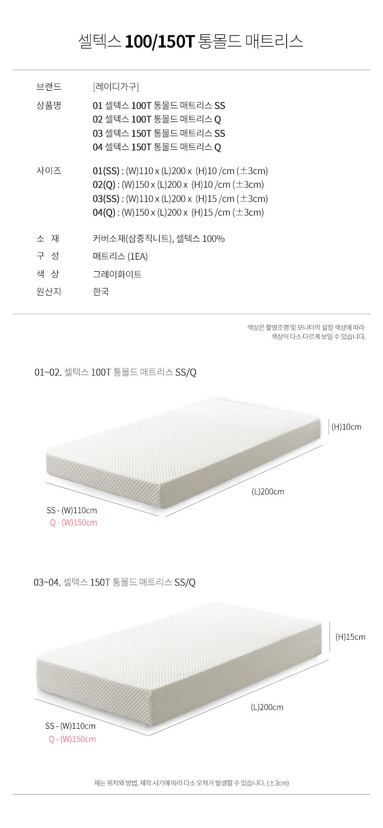 슈퍼싱글 (SS) : (W)100 x (L)200 x (H)10 / (+/- 3cm)